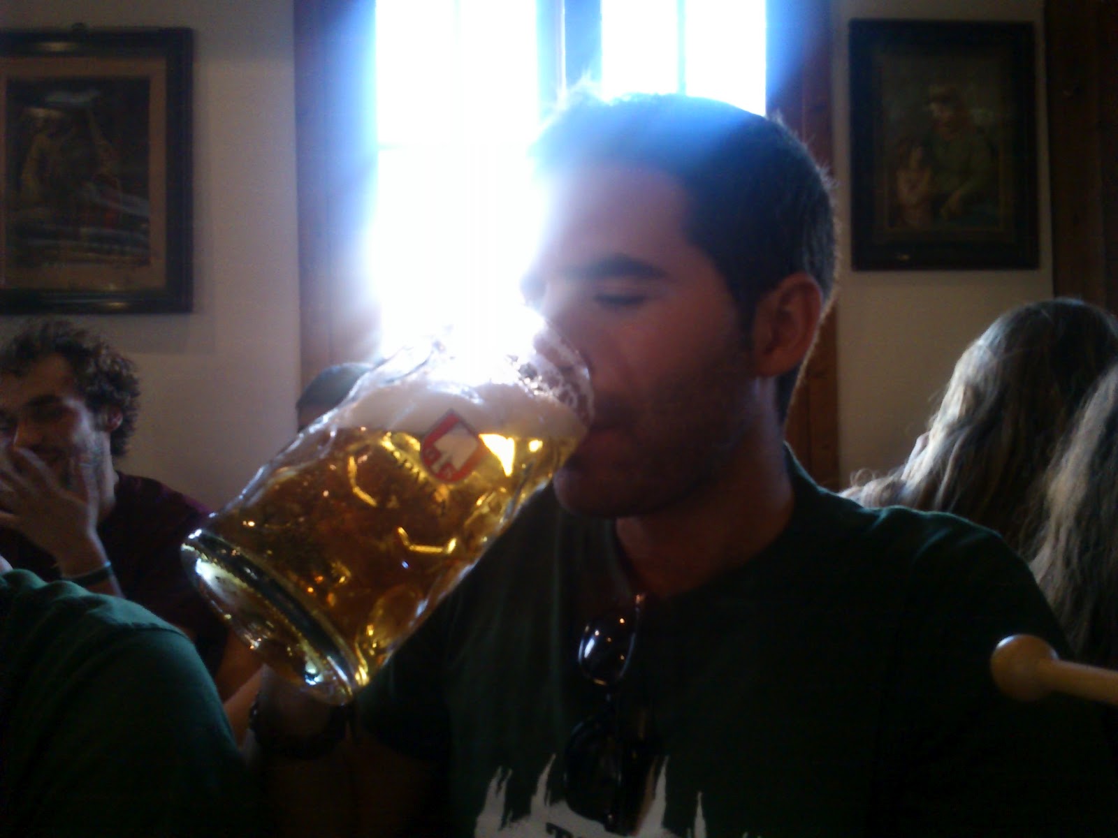 Mierda. Mierda mierda. Ya decía yo que nos habían recomendado que la visita a la ciudad la hiciéramos por la tarde. Y que cogiéramos sitio por la mañana en las «macrocasetas». Allí no es que haya más gente que en la guerra o que en la cola del INEM de España, ES QUE ME TIENEN ACOLAPSAO EL JODIDO RECINTO. No cabe nadie más. Literal. De repente el no haber hecho caso a los organizadores del viaje no me hace ninguna gracia, pero por fortuna conseguimos entrar en una de las casetas. Pequeña, ambiente típico bávaro, orquesta tocando música alemana. Y jarras de litro de cerveza. Grande.