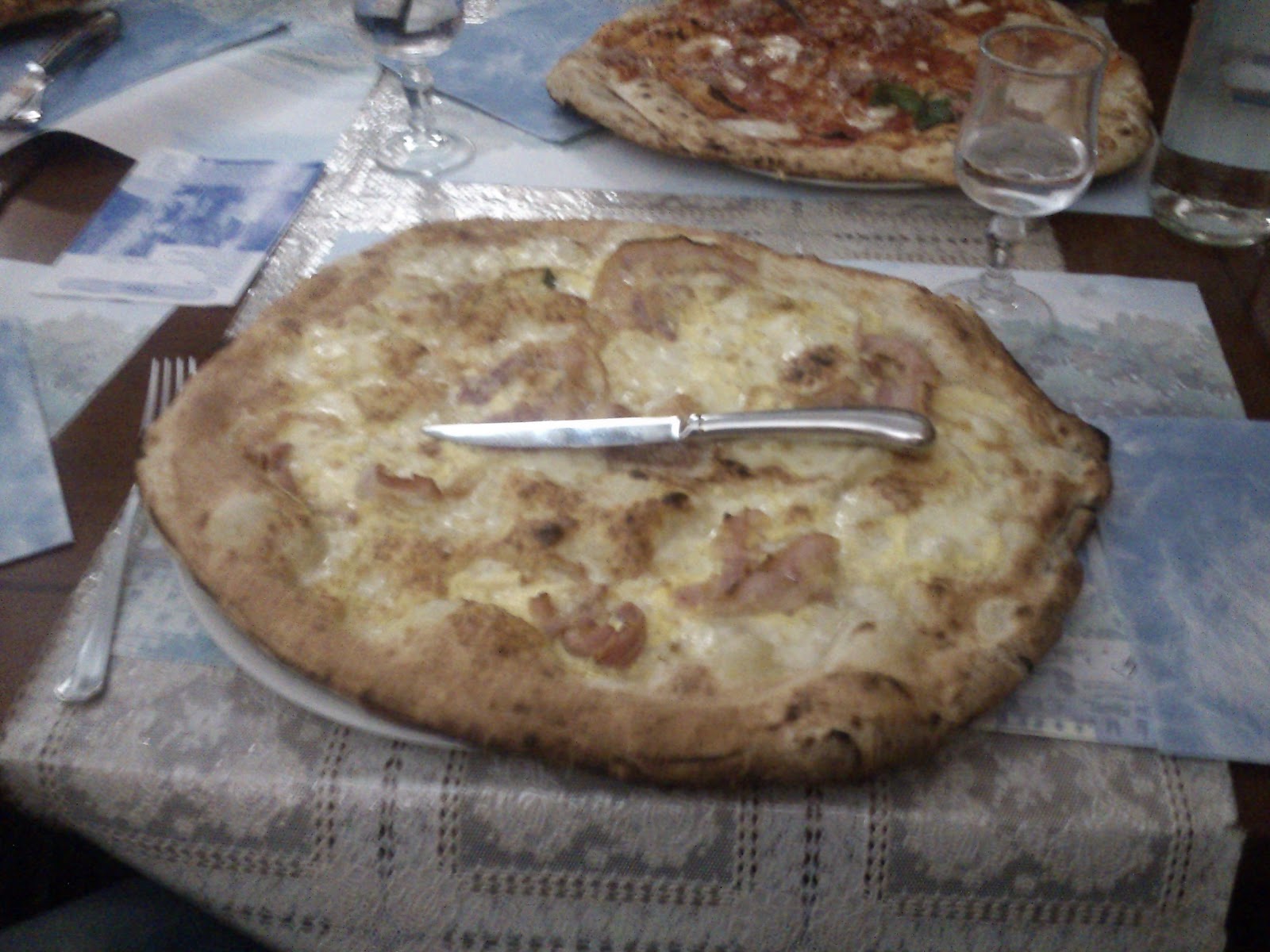 Por la noche, y después de haber alumbrado la vida de Pablo con el vídeo del «Pulcino Pio» que no conocía, nos lleva con otros amigos a cenar a una pizzería. ¿Cenar? Perdón quise decir CEBAR. Cuando me traen la mía me atraganto con el agua y le digo al camarero que se han equivocao, que yo pedí una de tamaño normal, no XXXXL. La mira, me mira, y dándome una palmada mental en el hombro me dijo «chaval, ésta es la normal»: