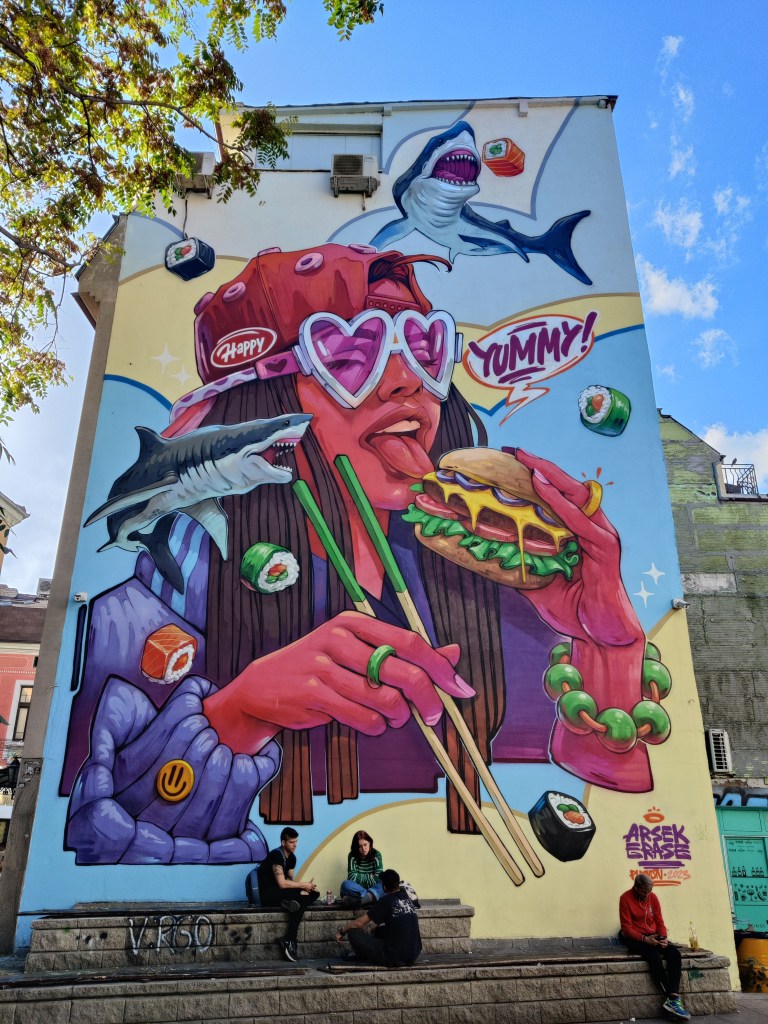 Qué ambientazo, qué buen rollo, qué callecitas, qué edificios, qué gente más simpática, qué bohemia (((palabra trendy para Plovdiv, todo sea dicho))). Para quedarse a vivir una temporada. Barrio de Kapana para comer y cenar, y luego musicote en el No Sense. Plan sin fisuras.
