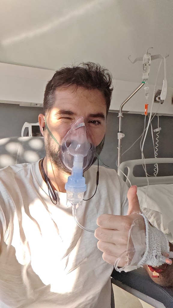 Lo que sí fue divertido fue ver la cara de mi primera visitante, que acudía a dejarme caprichos de comida y un cargador de móvil. Resulta que tras la primera enfermera que me puso el gotero, acudió otra a enchufarme antibióticos y colocarme un nebulizador. El nebulizador este no deja de ser una mascarilla que evapora un líquido que ayuda a abrir los pulmones, sin más, pero la estética hace que parezca que te quedan 2 minutos de vida, literal. Como mientras tenía eso puesto no podía hacer gran cosa, me tumbé en la cama a hacer lo que llevaba deseando desde que había entrado en la habitación 404: cama arriba, cama abajo, cama arriba…y así estaba yo, con pinta de estar a punto de morirme y haciendo el capullo cuando llegó mi amiga. Amiga que se fue preocupada, como es normal. Tampoco se quedó mucho menos preocupada la siguiente que vino, que por suerte para mí me trajo un libro de regalo.